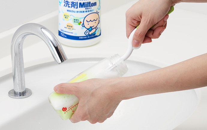 「洗剤Milton哺乳びん・さく乳器・野菜洗い」で使ったベビーグッズをしっかり洗います。哺乳びんなどはパーツごとに分けて洗いましょう。