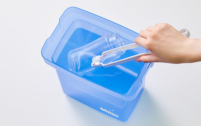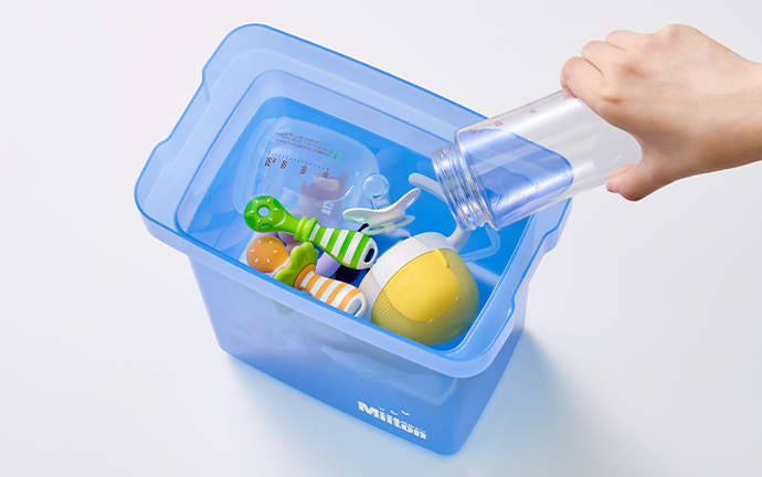 4Lの水にMilton CPを2錠入れ、気泡が入らないように、ベビーグッズ全体を溶液に浸します。1時間以上つければ除菌は完了。溶液は24時間使えるので、1日に何度も除菌できます。
