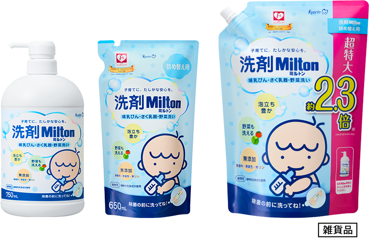使用後の哺乳びんやさく乳器、おしゃぶり、おもちゃなどのベビーグッズは、ミルクやだ液などのタンパク汚れが残っています。このままにしておくとバイ菌が発生して不衛生な状態に。洗剤Milton哺乳びん・さく乳器・野菜洗いをお使いいただくことで、ベビーグッズを清潔な状態に保つことができます。赤ちゃんが口にするものは、きちんと洗浄・除菌しましょう。